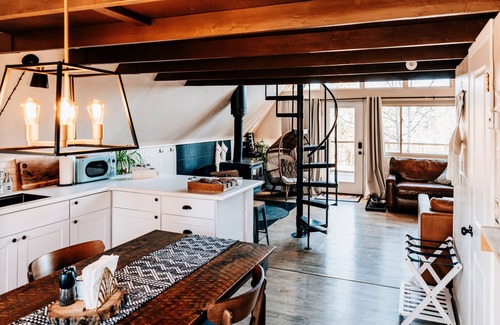 The cabin's thoughtful design includes a lofted bedroom with a king bed with a new Helix Mattress, offering a snug and private space for a restful night's sleep. Two pull-out couches in the living area provide additional sleeping arrangements, making the cabin suitable for a small family or a group of friends. Large windows throughout the cabin frame picturesque views of the surrounding woods, bringing the outdoors in and allowing natural light to flood the space.