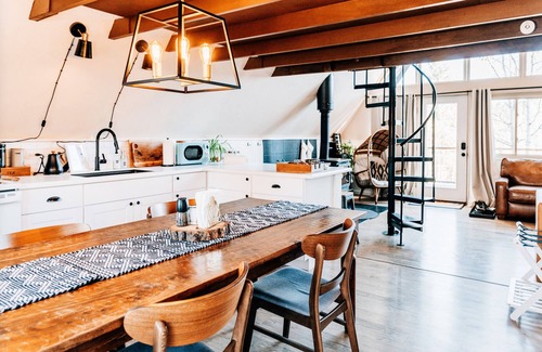 We will allow pets who qualify. At this time we only host dogs. Please message us before booking for our pet policy to see if your dogs qualify. There is an additional fee for bringing a pet to cover the cleaners’ extra time to keep the space fresh for future guests. Please note the only way to the loft is the spiral staircase which is not safe for pets. When we have our pup there he sleeps in the lower level.