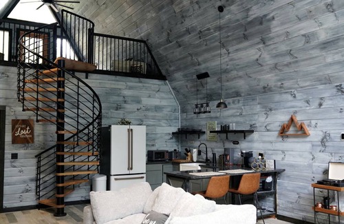 This not so tiny home has everything you need for an intimate mountain retreat. With an open layout master bedroom, a window to the shower and an in-room soaking tub, romance is at your fingertips. A variety of amenities provides couples with things to do together during their stay include an entertainment loft with a projector, arcade table, vintage board games, and record player. The home sits within a wooded property creating privacy for outdoor amenities like the outdoor shower, bbq, fire pit, outdoor swing and hot tub.