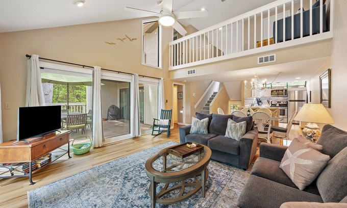 As with all of our villas, enjoy great extras like a free fitness center pass, a couple of free bikes for exploring the beauty of Sea Pines, and free tennis at South Beach. Wildwood Spa enjoys an on-site pool shared by few properties, so it is always quiet and enjoyable. The neighborhood also has an on site practice court, which is also good for pickleball as well. Take your coffee out on the deck and take in the view, or relax in the sunny living room or loft. The extra space and sleeper sofa in the loft and double beds in the guest room makes this property ideal for groups looking for a little more space and flexibility than the traditional two bedroom.