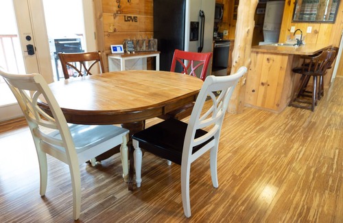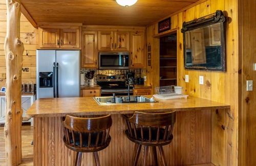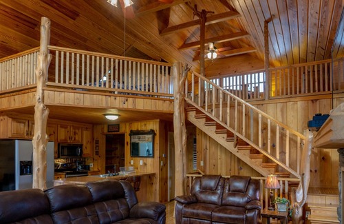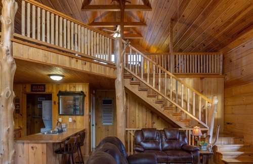 When you enter the cabin you will be blown away. This cabin is a true custom built log home built with 12 inch hand milled logs from Arkansas. If you look closely at the pictures you will notice several trees that actually help support the loft. These trees were actually cut right from this property and add to the uniqueness of our beautiful cabin. There is an abundance of natural light through out this cabin thanks to all the windows on all 4 sides plus the windows up high which allow you to take it all in. The main floor is Bamboo. They are gorgeous! French doors open to an open floor plan, fantastic for entertaining. The kitchen boasts stainless steel appliances, a fully stocked kitchen with plenty of everything you need to enjoy your stay, a large pantry area/laundry area. The kitchen is open to the dining area with seating for 4 as well as 2 bar stools. The living room is loaded with comfort. A leather reclining sofa, a leather reclining love seat and an over sized leather power recliner all positioned around a wood burning fireplace and a huge smart tv over the fireplace. Head down the hallway and you will find the master bedroom with a King Size pillow top bed, chest of drawers with mirror, your very own flat screen tv and a huge closet to store all your stuff out of sight. There is your very own door to the deck if you want to sneak outside. It even has the coolest screen door like grandma used to have. The bathroom is right across the hall. Large shower with seat, awesome shower head with great pressure, an adorable vanity and plenty of shelving stocked with towels, washcloths, etc.