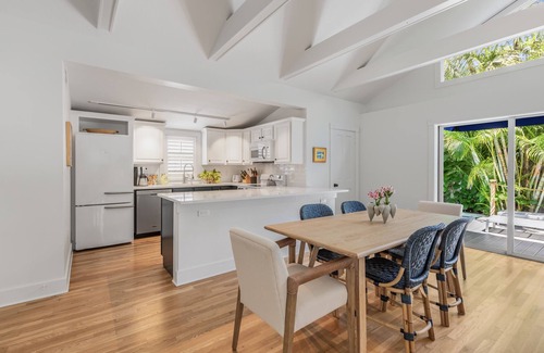 Welcome in to an inviting, open floor plan boasting vaulted ceilings, hardwood floors and stunning wooden beams ready to entertain your crew for your getaway to Paradise. A fully equipped kitchen allows for seamless meal prep to enjoy together at the dining table for 6. Enjoy the bright and cheery living space with cozy furnishings and a TV for your lazy days in with gorgeous views beyond pocket doors of your outdoor oasis. This home is equipped with Youtube TV for live steaming.