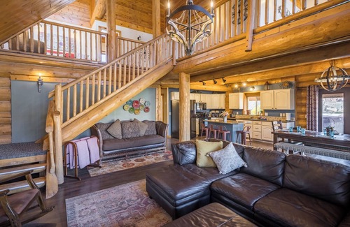 The main floor has a great room with living, dining and kitchen all shared -- a wonderful large space to gather and relax. The living room has a high vaulted ceiling, gas fireplace, and a 55" flat screen with a Blu-ray Player and Netfix, Hulu and HBO Go accounts for you to relax after your adventures. Dining room has an extendable table that can sit up to 10 (12 if you've got kids). Seating for 4 more in the kitchen around the island. Kitchen has beautiful quartz countertops, rustic farmhouse style cupboards, and plenty of space to have a few cooks in the kitchen. Master bedroom has a queen bed and twin bunks, large closet, attached bathroom, and a private deck. Laundry room and 1/2 bath are in the back out of the way.