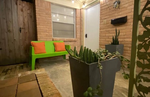Charming 1650 sf duplex on tree lined street a few blocks from the Texas Med Center. This is a private two story duplex with one bedroom downstairs with king size bed and a second bedroom upstairs. The upstairs bedroom has 2 queens beds and private bathroom. The updated kitchen, luxury furnishings, premium mattresses make this a luxe option for families visiting MD Anderson. Private parking, easy access to Rice Universty, Hermann Park or walk to numerous shops and restaurants in Rice Village.