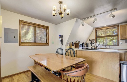 Bright, functional, and cabin-cozy—this kitchen has everything you need to prepare hearty mountain meals or a quick breakfast before hitting the trails. Brew your morning coffee at the stocked beverage bar—complimentary pods included—and add flavor with a curated spice rack. Enjoy meals or games around the dining table with forest views, with a high chair available for little ones.