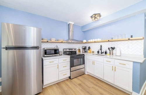 There is one fully equipped bathroom with shampoo, conditioner, and soap. The kitchen is fully equipped with all utensils, appliances, and dinnerware needed for cooking during your stay.