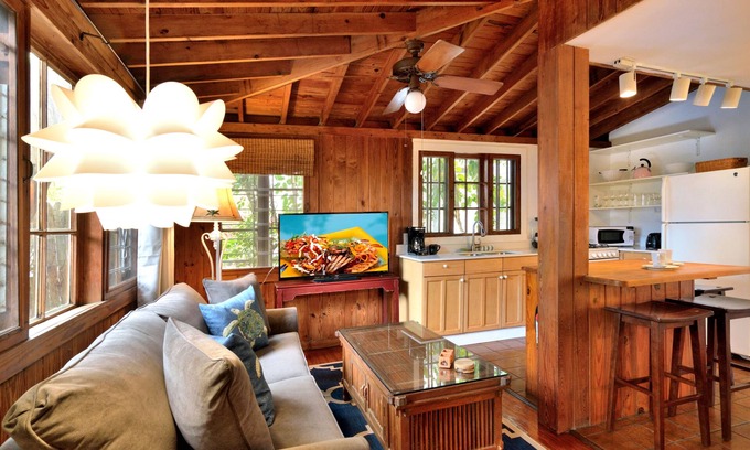 THE PROPERTY: Bohemian bits indoors and lush landscaping outdoors will give you that tropical island feeling you are looking for. Warm wood tones and exposed beams can be found in the main living area. The family room with sofa, chair, and TV is open to the kitchen and dining areas. A wooden island with seating is the perfect place to enjoy a snack or beverage. A bright kitchen provides all that you will need to prepare meals. However, while on vacation, you may prefer to walk to one of Old Town’s amazing restaurants.