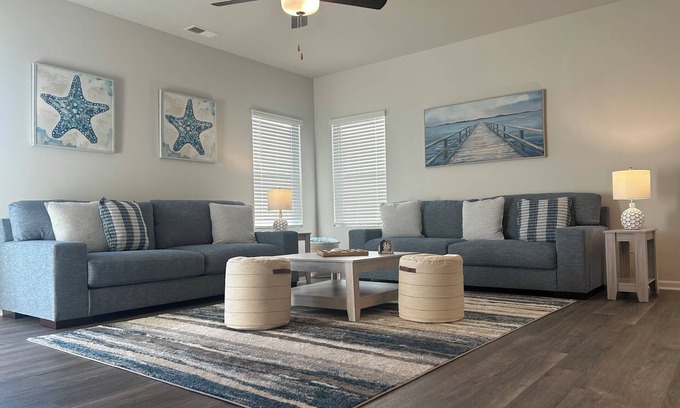 Welcome to this new home located in Southport, NC, a quaint seaside town with preserved historic charm. Just 3 miles from Oak Island Beach with fishing, snorkeling, swimming, golfing and the most beautiful sunsets! Also, just 4 miles from downtown Southport, with waterfront dining, fresh seafood, shopping and more. A popular filming location for “Safe Haven” and many more! This home offers a beach-inspired vibe making it fit the Perfect Getaway with surprise amenities!