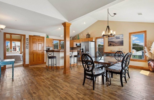 Main Level: Living Area w/Cathedral Ceilings, Wood Floors, & Gas Fireplace; Covered Porch; Kitchen w/Stainless Steel Appliances; Dining Area w/Wine Fridge; King Master Bedroom w/Private Bathroom (Shower Only); Full Hallway Bathroom (Tub/Shower Combo); Queen Bedroom; Bedroom w/2 Twin Beds