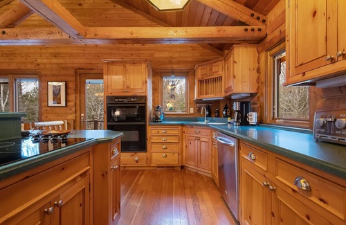 The Lodge on Caribou Lake is a spacious 3 bedroom, 2 bath log cabin that can sleep up to 10 people. Enjoy the open kitchen, dining room, and living room, boasting large wooden beams that give it a lodge feel. Take advantage of the fully equipped kitchen and large dining room table as well as a roomy island with 4 stools. For the cooler months, enjoy the warmth of the wood fireplace.