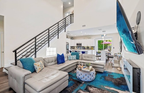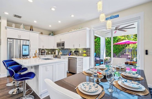 Bachelorette weekends, girls trips, family vacations — this is the house groups keep coming back to. Heated pool with in-water lounge chairs, designer coastal interior, private backyard, and a fully stocked bar cart with martini and wine glasses ready when you arrive. Sleeps 10. Walk to Publix. 5 minutes to Atlantic Ave and the beach.