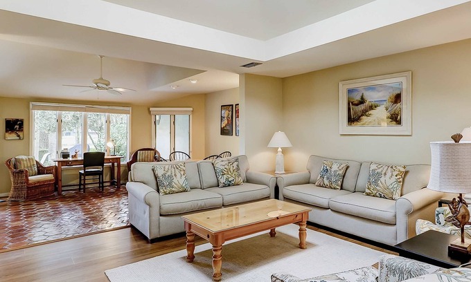 Beach Lagoon Villa 309 - location is everything! This beautifully decorated three-bedroom Sea Pines villa is just a short and easy three-minute walk to the beach. As you enter through the private courtyard, you will immediately feel relaxed and on vacation.