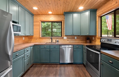 This 3 bedroom, 2 bath chalet is one of the most unique properties at Innsbrook. The interior is very comfortable and perfect for one or two families to share. Beautiful cedar walls and ceiling, rustic wood burning fireplace and absolutely breathtaking views of Lake Grendel. The master bedroom is on the main floor with lake views from the queen size bed. The second floor has a spacious loft, where you'll find a pull out futon that sleeps two. Another queen bed is in the 2nd bedroom. The 3rd bedrooms is a custom "bunk room", with a total of 9 bunk beds, all twin size. There's also an extra twin mattress conveniently stored as a trundle under one of the triple bunks.