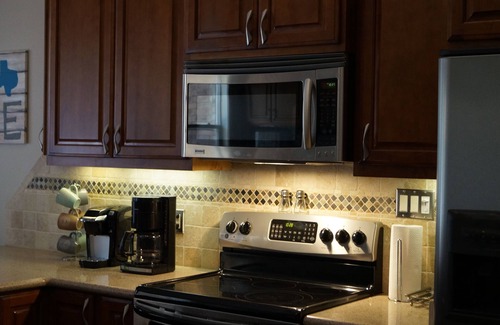 The beautiful kitchen is equipped with granite countertops & modern stainless steel appliances, pots & pans (including other cooking essentials), basic spices & condiments. Coffee bar includes a 12 cup coffee maker & Keurig.
