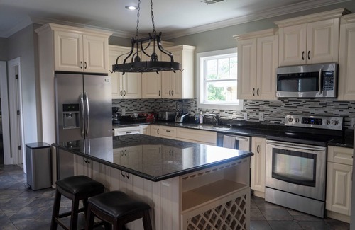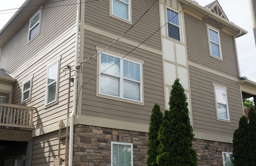 The city does not allow home owners to advertise more than four bedrooms even rooms have private doors. This 9 sleeping area + 8 Bath complex has a Traditional Four Square/Craftsman exterior with an ultra contemporary yet comfortable interior. The exceptional details in these homes will add luxury to your Nashville experience. The properties feature beautiful hardwood floors, professional grade stoves/ovens, 9 foot ceilings, flat screen TVs with cable, ceramic tile in kitchen and bathrooms, granite counter-tops, a lovely deck setting in the middle of the houses, and free WiFi, all in coolest part of Nashville.