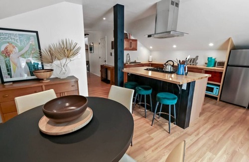 The space has an open studio design. The open-concept kitchen is sure to delight the chef with it`s island seating, lounge seating and dining area. The living room has a full size pull-out couch for the kids and a 55` TV. The modern bathroom is newly remodeled and has a walk-in shower. The beautiful copper bed frame has a queen size bed, 45` TV with small fireplace which create a cozy den to snuggle up. There is a washer/dryer combo located in the unit.