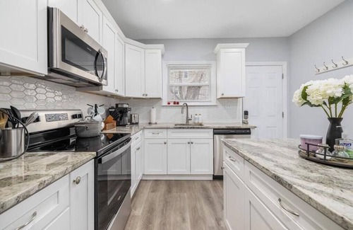 Your cozy getaway awaits in Providence at this marvelous house. With 5 bedrooms (3 of which on the main floor) including 3 queen beds, and two full baths and a spacious living and dining, there's plenty of space for everyone. Enjoy the convenience of a full kitchen, cozy living and dining room, WiFi, a hair dryer, iron, AC, and heating. The bathroom comes equipped with a hair dryer, and there's an additional living room with a futon for extra relaxation. Coffeemaker, free snacks, Board games, fire tvs, speakers and bluetooth player will keep you entertained if you decide to stay in. But you will want to go out and explore: many restaurants and shops in this dynamic and historical Elmhurst neighborhood, and you are just 2 blocks from the beautiful campus of Providence College. Downtown providence is a 5 minute drive away, and you have 2 parking spaces reserved for your party with more on the street. You're sure to make fantastic memories with a stay at our place.