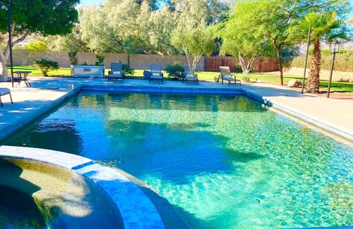 This gorgeous modern hacienda home has beautifully landscaped 2 acre grounds with Mountain Views. If anyone in your group loves sports, there is plenty of grassy areas for soccer, volleyball & basketball (nets & balls are provide). This spacious home features 5 bedrooms with 8 beds. It is also centrally located between Palm Springs, Indio and Palm Desert without the noise and busyness of the city & yet within 3 miles to Walmart & Costco & minutes to all the dining at El Paseo.