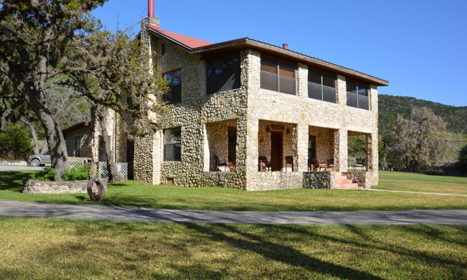 Circle H Lodge, an historic house from the early 1900's, is near Leakey in an area of the Texas Hill Country noted for magnificent scenery. Yes, we're close to Concan, TX, too. The lodge is located in a lovely, secluded valley on Circle H Ranch. This is a working ranch devoted to the preservation of wildlife and is home to many species of both native and non-native animals. The lodge is decorated in Cowboy High Style with antiques and Cowboy -Indian memorabilia. There is a natural rock swimming pool in front of the lodge which is only accessible by LODGE GUESTS. During the evening hang out with family or friends at the old cantina located behind the lodge.