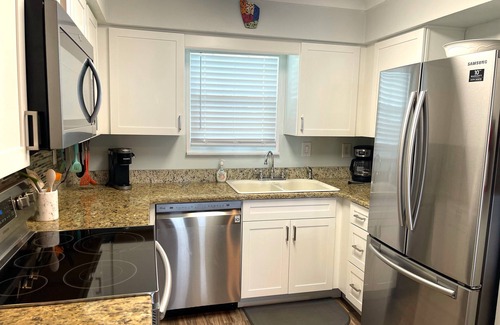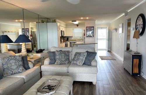 The fully equipped, open-concept kitchen with stunning granite countertops, stainless steel appliances, and a spacious island is perfect for entertaining. The living room features a brand new sofa and loveseat, cable TV, and complimentary WIFI. Access to the waterfront balcony from the living room and master suite allows for enjoying the coastal breezes and views of the Gulf, pool, and Ole River.