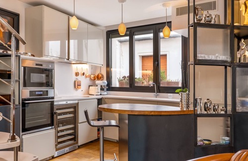 No smoking, pets, or parties! This home is set over two floors with step access and a private roof terrace above. A Jacuzzi on a sunny roof with views of the Eiffel Tower is on everyone's bucket list and this one is available all summer, from June to September. There's also an electric BBQ for those post-dip al fresco dinners. Please be aware, there are cameras within the security system for this home. Pictures are only taken if the alarm goes off.. A dog and cat usually live here. The spiral staircases, though impressive, make it unsuitable for children. Air-conditioning is available in the living room and bedrooms.