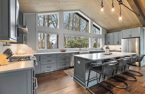 Situated less than five minutes from Sugar Mountain Ski Resort and Sugar Mountain Public Golf Course, this four-bedroom mountain home is the perfect retreat for a year-round mountain escape. Sugar Grand is a recently renovated single-level home showcasing high ceilings and stunning hardwood floors that create a seamless flow throughout. The expansive family room features vaulted ceilings adorned with exposed wood and metal beams, lending a contemporary vibe. After a day on the slopes or hiking your favorite trail, unwind on the sectional while enjoying the warmth of a wood-burning fireplace. A wall of windows fills the room with natural light and showcases the stunning mountain vistas. The chef's kitchen boasts a gas stove, ample cabinet space, and quartz countertops to meet all your culinary needs. A large island with seating for four serves as an ideal spot for friends to gather. The partially covered back deck, accessible from the dining area and all four bedrooms, stretches the length of the home. Fire up the charcoal grill for a delicious dinner, savor your morning coffee, or relax in the hot tub while soaking in the year-round views.
