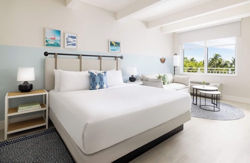 Situated on a higher floor, this room at Blue Flamingo Resort offers panoramic views of Key West's charming landscape. Featuring a king bed and modern amenities, it's a serene retreat above the island's bustle.