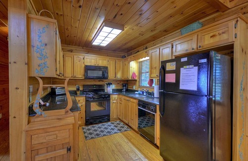 Inside, Sunset Ridge boasts a spacious family room, complete with a cozy wood-burning fireplace and plush seating—ideal for gathering together to watch a movie, play board games, or simply enjoy each other's company. The upscale granite countertops and custom wood dining table add a touch of elegance to the cabin's rustic charm, making it the perfect setting for family dinners or romantic meals for two.