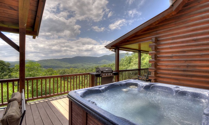Sunset Ridge - Pet-friendly retreat boasts panoramic mountain views, oversized deck with hot tub, grand outdoor fireplace, captivating sunsets, and WiFi is located in Ellijay. Sunset Ridge - Pet-friendly retreat boasts panoramic mountain views, oversized deck with hot tub, grand outdoor fireplace, captivating sunsets, and WiFi provides accommodation, featuring TV, Barbecue/Outdoor Cooking, Internet, among other amenities. This Cabin features TV, Barbecue/Outdoor Cooking, Internet, to make your stay a comfortable one.