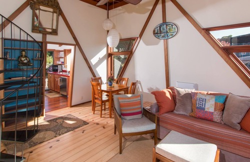 Downstairs there is a queen sleeper sofa with a flowering garden and pond just beyond the triangular glass paned windows. The spiral staircase leads to a airy room with a queen bed. In winter you may see the grey whales as they migrate down the coast of California, and in the Spring the headlands are covered with wildflowers. The galley kitchen, where simple meals can easily be prepared, opens onto a garden patio where you can enjoy your meal, or there is a cozy dining area in the main living space.