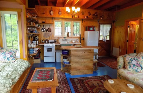 The living room offers incredible views of the Hudson River and the meadow below. There are leaded glass windows in the bay window, a large comfortable vintage sofa and simple decorations. The bedroom offers a queen bed with duvet covers and beautiful east facing views of the Hudson River. There is an antique vanity with vessel sink, antique oriental rugs and Asian artwork. The bathroom has a claw foot tub with shower hoop and glass vessel sink. There is plenty of hot water, towels and soap. The kitchen is fully stocked with stove, fridge, microwave and sink. There are beautiful copper pans to cook with, plates, glasses and silverware.
