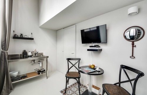 The Brune V is an urban Sweett studio apartment that reflects perfectly the modern diversity of its neighbourhood here in the XIV arrondissement. Our local interior designer has drawn inspiration from the literary legacy of Paris to fashion a sophisticated yet serene ambience. The sleek black-and-white colour scheme evokes the glitz of silent movies, while captivating trompe l'oeil art infuses a whimsical element. Ascend the ladder to reach the secluded loft bedroom, where the cosy bed will lull you into a peaceful slumber.