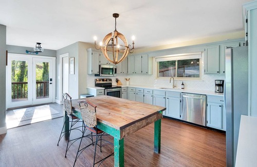 Is it the open space of the kitchen, dining, and living room or the large windows that capture waterfront and mountaneous views that draw you in here at our Riverfront Cottage? We're not sure, but can tell you both are worthy. This space is great for quality family togetherness time.