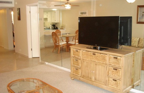 This condo suite is updated with all new furniture and boasts two large bedrooms and two private baths. In the Master Suite, there is a King sized bed along with dresser, night stands, large closet and big screen TV. Wake up each morning to the rolling surf just outside your sliding doors to the patio. The Guest Suite has two Twin beds (conversion to King upon request) as well as dresser, night stand, large closet and big screen TV. The living room features a sleeper sofa, recliner, and additional seating as well as a big screen TV. High speed internet/WiFi provided.