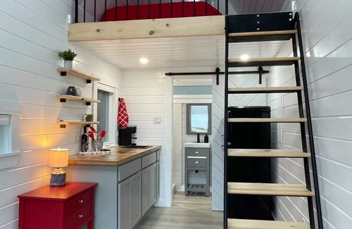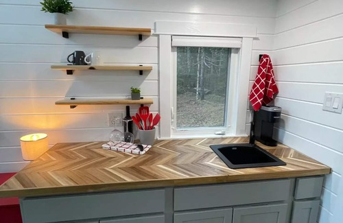 Peace and quiet! Relax in the natural beauty of the forest while being just a few steps away from Clearwater Lake! Can’t beat this amazing view, it leaves very little to be desired. This adorable tiny home is equipped with all of the amenities you would expect from a traditional home. The kitchen is fully equiped with a toaster oven, countertop hotplate, apartment size fridge, coffee machine, microwave, etc. The bathroom is very functional with a fully tiled shower. There is a heat pump which gives you airconditioning in the summer and heat on the cooler nights. Admire the lake view through the large windows and experience the sunrise without getting out of bed! This tiny house is ideal for 2 people.