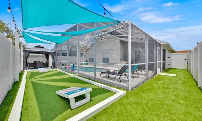Located 7 miles from Disney is the perfect vacation stay. This house has an out of the ordinary 10 foot theater! It gives an outdoor feel while staying at a comfortable temperature and mosquitoes away. 4 oversized seated hammocks makes for a comfortable relaxing movie. We also have an Xbox 1s hooked up for the kids so play video games while engulfed in giant bean bags. Our speakers make you feel like you are in the actual theater with 6 speakers located around the room to give you a Cinema feel. Every TV is linked with Amazon Firesticks to watch the shows and movies you watch at home!