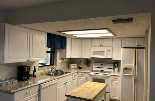 Your day starts with the warm glow of the Florida sun spilling through the windows of the living room. Someone might already be stretching awake on the pullout sofa—yes, it has a real mattress for true comfort. You brew a cup of coffee using the fully equipped kitchen, stocked with everything from an Instapot and toaster to a blender, coffee pot, and all the cookware and utensils you need. The full-size French door refrigerator, smooth-top electric range, microwave, and dishwasher make every meal easy.