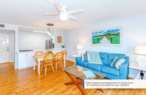 The balcony is great given its Southern exposure, which offers the most sunlight! There are big glass sliding doors in the living room & master bedroom, both of which open up to separate balconies. This unit comes with everything you would need on a vacation such as free high-speed wireless internet, beach toys and accessories, linens, towels, a full kitchen, in unit washer/dryer and much more. You can comfortably sleep 4 people with a king bed in the master bedroom, two twins in the guest bedroom. * Air mattress available for additional sleeping space