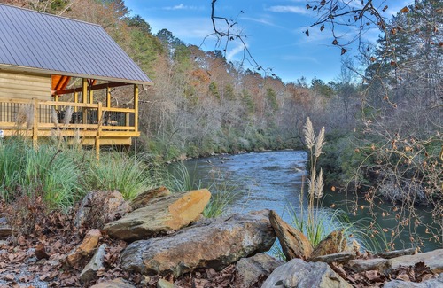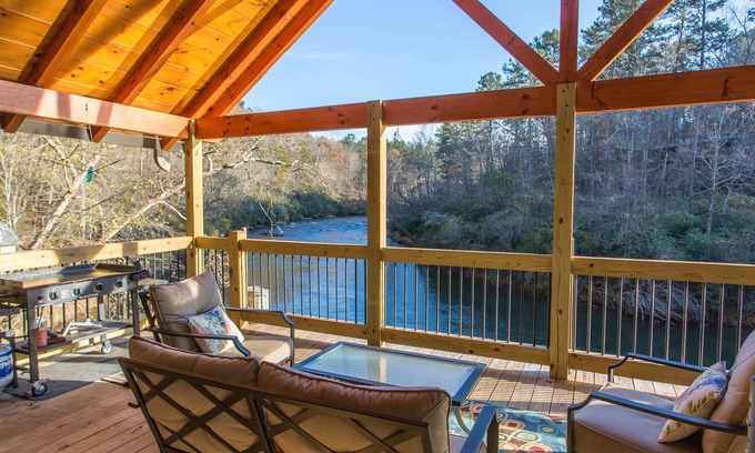 Escape to a private gated riverfront retreat in Ellijay with two luxury lodges, room for 14 guests, and more than 1,200 feet of Coosawattee River frontage. With expansive outdoor living areas, a private hot tub, and separate cabins that let groups spread out comfortably, this property is ideal for family gatherings, couples traveling together, and relaxed mountain getaways.