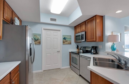 The Master suite features new bedroom furniture with a new King-sized bed and Beautyrest mattress and boxsprings. Also, is a flat screen TV with DVD player. Enjoy the Gulf front views from a large bay window in the large comfortable accent chair, or step through the private entrance to the expansive main balcony. There's plenty of room in the Master walk-in closet. The large master bathroom features a jetted tub, spacious walk-in shower, two sinks and lots of countertop space!