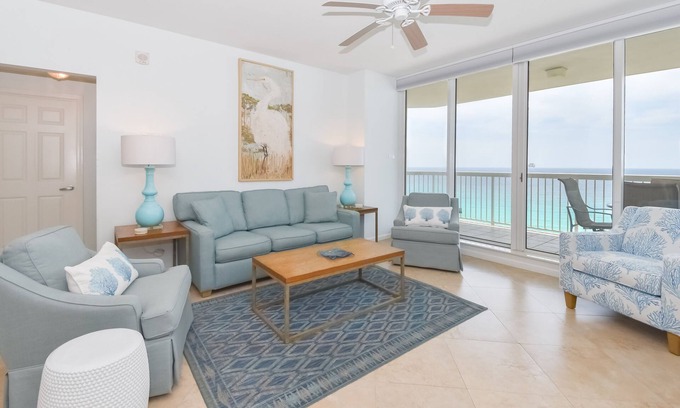 RECENTLY UPDATED luxury condo with new coastal-themed furnishings and new elegant 20 inch travertine tiled floors throughout except the bedrooms, which have newly installed beautiful plank flooring. Graber blackout shades in the living room and both bedrooms allow full 180 degree Gulf front views of the sugar-white beach and emerald ocean water along with the sunset and sunrise.