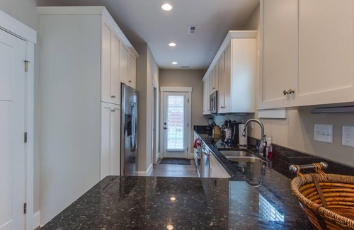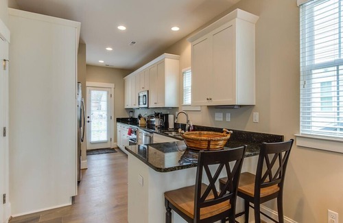 This 2 story, 2 bedroom townhouse sleeps 4 people comfortably. With 2.5 bathrooms, high-end furnishings, 10-foot ceilings, an attached single-car, private parking garage, additional free on-site parking, ceiling fans in each room, 60 inch flat screen TV in the Living Room, washer, dryer, stainless steel appliances, working kitchen and granite counters, pantry storage, 2 large walk-in closets, upstairs porch with rocking chairs, basic cable and free WiFi, our house is comfortable and functional.