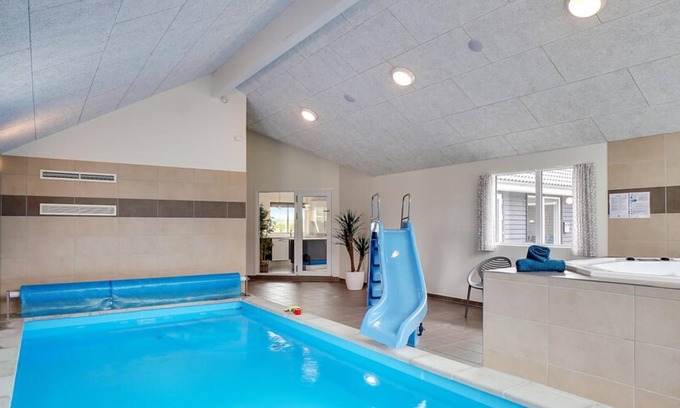 This text describes a meticulously designed holiday home located by Venø Bay in Denmark\\'s Limfjord region. The house is ideal for large family gatherings or multiple families, accommodating up to 30 guests. It is situated near a child-friendly sandy beach and is 20 km away from the market town of Skive.The house boasts a variety of facilities including a large indoor swimming pool with a water slide and counter-current system, a whirlpool, and a sauna. For entertainment, there is an activity room with table tennis, billiards, table football, darts, a PlayStation 4, and a home bar. The central kitchen/living space is well-equipped with double ovens, sinks, cookers, and dishwashers, and overlooks the pool area.The house has five bathrooms and twelve double bedrooms spread across four distinct areas, allowing for privacy among different families. Additional sleeping spaces are available in the loft, accessed from the activity room.Outside, there is a large play area and a multi-purpose court shared with the neighboring house, featuring a variety of sports facilities. The garden also includes an in-ground trampoline. The house provides a perfect blend of relaxation and high-energy entertainment, making it an ideal holiday destination.Please note that this VillaVilla house may not be rented by youth groups.