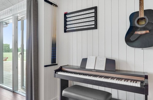 This luxurious house in Hostrup, near the Limfjord, can accommodate up to 30 guests and is located in scenic surroundings close to the beach. The house is 335m2 in size and sits on a large, secluded natural plot overlooking fields and valleys. With 10 bedrooms in three sections, three bathrooms and an extra one in the pool area, there is plenty of space for everyone. The house is disabled-friendly and also has family rooms. The house is well equipped with a large kitchen that includes two dishwashers, ovens, sinks, large hobs and an American fridge. There is also an outdoor kitchen with charcoal and gas grills and a gas-heated pizza oven. Indoors, there is a large pool with a water slide, Roman steps and counter-current system. \r\n\r\nThere is also an indoor hot tub and sauna, as well as an outdoor spa area with jacuzzi and outdoor shower. The activity room includes a bar, billiards, pool, air hockey, table tennis and table football. There is also a sofa corner for films, a Playstation 5 and musical instruments. Outdoors there is a large sandpit, climbing tower, swings, seesaw, trampoline, multi-purpose court, basketball hoops, petanque court and an east-facing morning terrace. The garden has an herb garden and fruit bushes with edible berries. The house is environmentally friendly with solar panels and green wind turbine power. The area offers beautiful nature, beaches, kite or windsurfing, swimming, fishing and attract