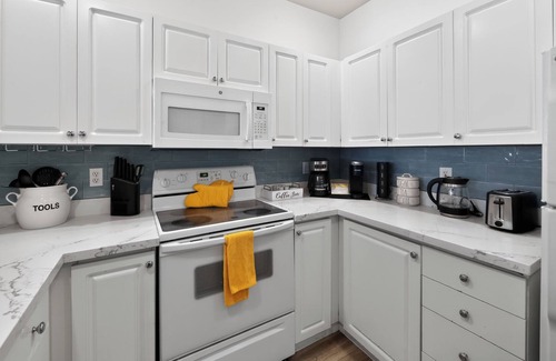 Inside this upscale condo, you'll experience chic & modern furnishings, a fully equipped kitchen, and a cozy living space that has a peekaboo view of the waterfront from the balcony. This newly renovated condo features 1 King bed, 1 Queen sofa bed, and an in-unit washer/dryer.