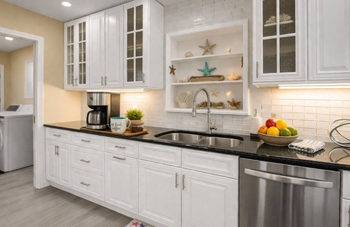 The kitchen is fully stocked for real group meals — quality cookware, full dish sets, coffee setup, and a dining table that seats six with breakfast bar seating for three more. Laundry is available for longer stays.