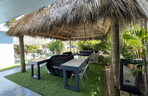 Front Yard- The front yard of this home has been transformed into a resort like hideaway with two oversized tiki huts, lush tropical foliage, soft faux grass and a luxurious seating area with comfortable high end couches and chairs. The large custom made restaurant style hibachi grill with surround seating for 8 is the perfect place to grill your steaks, seafood and fresh catch paired with fresh veggies purchased from the local weekly farmers market. (Grill should be fully cleaned after each use and prior to departure). The outdoor wood burning fire pit is surrounded by four heavy duty polywood Adirondack chairs perfect for late night chats and s’mores around the campfire.