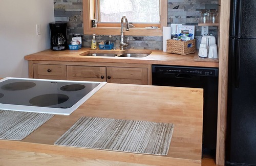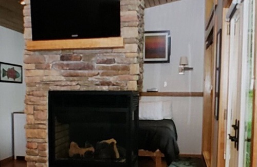 Our Butternut Cabin was built in 2011. It has the modern conveniences of AC, heated floors, dishwasher and 2 way fireplace but keeps the feel of an up north cabin with use of wood and natural materials. The floor to ceiling windows facing the lake allow you to feel like you are outside in any season. The cabin floor plan is studio style with the gas 2-way fireplace separating the king sized bed from the living area. You can curl up, enjoy the scenery and warmth of the fire while reading a book or watching TV from the bed or living area. Free WiFi.