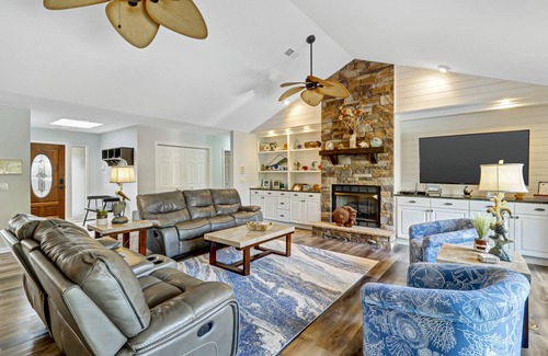 There are not many places like this home that are less then a 10 minute walk to the beach that have a pool, and is situated on a lake. We have games and activities for all the ages and everything you need to make this a memorable vacation. We will provide coolers, beach chairs, boogie boards and more. We have a sun room overlooking the pool with a wet bar. This home has a primary suite with a king bed, another bedroom with two queen beds and one with a queen bed and a trundle. This home has a total of five TV's with a 75' tv in the living room and 50' TV in the master suite. Our kitchen has commercial grade appliances.