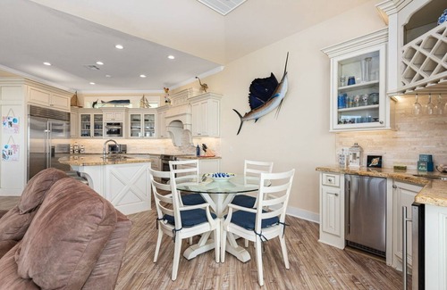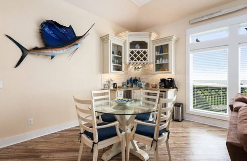WOW is what you'll say when you step into this incredible brand new beachfront home! Open concept great room with cozy areas for every activity and a fully stocked gourmet kitchen sure to please the most discriminating of chefs. The living area sofa and love seat offer built in recliners to stretch out and catch a movie on the huge TV after a long day in the sun. There is both informal and formal dining areas with room for overflow at the breakfast bar. Custom touches include a Sub Zero refrigerator, granite countertops, transom windows for extra light, and the latest in bathing luxury, an oversized air tub in the primary bath. The utility room, complete with sink, is conveniently located adjacent to the primary closet and bath. Each comfy bedroom is equipped with satellite TV. Then there's the spectacular outdoor space. The decks on the main level, with both sunny and shaded areas, offer amazing views of the Gulf, Galveston and even the Intracoastal. The upper deck with access from both bedrooms allows one to step out and breathe in the salt air first thing in the morning or star gaze before calling it a night. The sand shower downstairs has dual shower heads making it easy to rinse the beach off of all the kids at once! The fishermen will love the fish cleaning station with dual sinks. Wow will come to mind over and over again while you vacation in this magnificent beachfront home!!